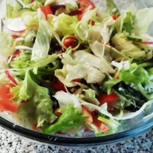fokhagymával pirított garnéla, friss saláta, kapros öntet, pirítós