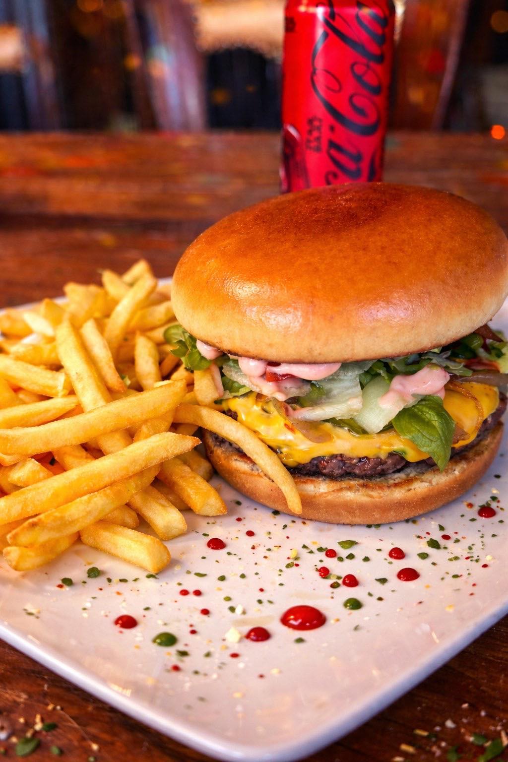 (házi hamburger szósz, marhahús pogácsa, paradicsom szelet, bacon szelet, cheddar sajt, karamellizált vöröshagyma, csemege uborka).